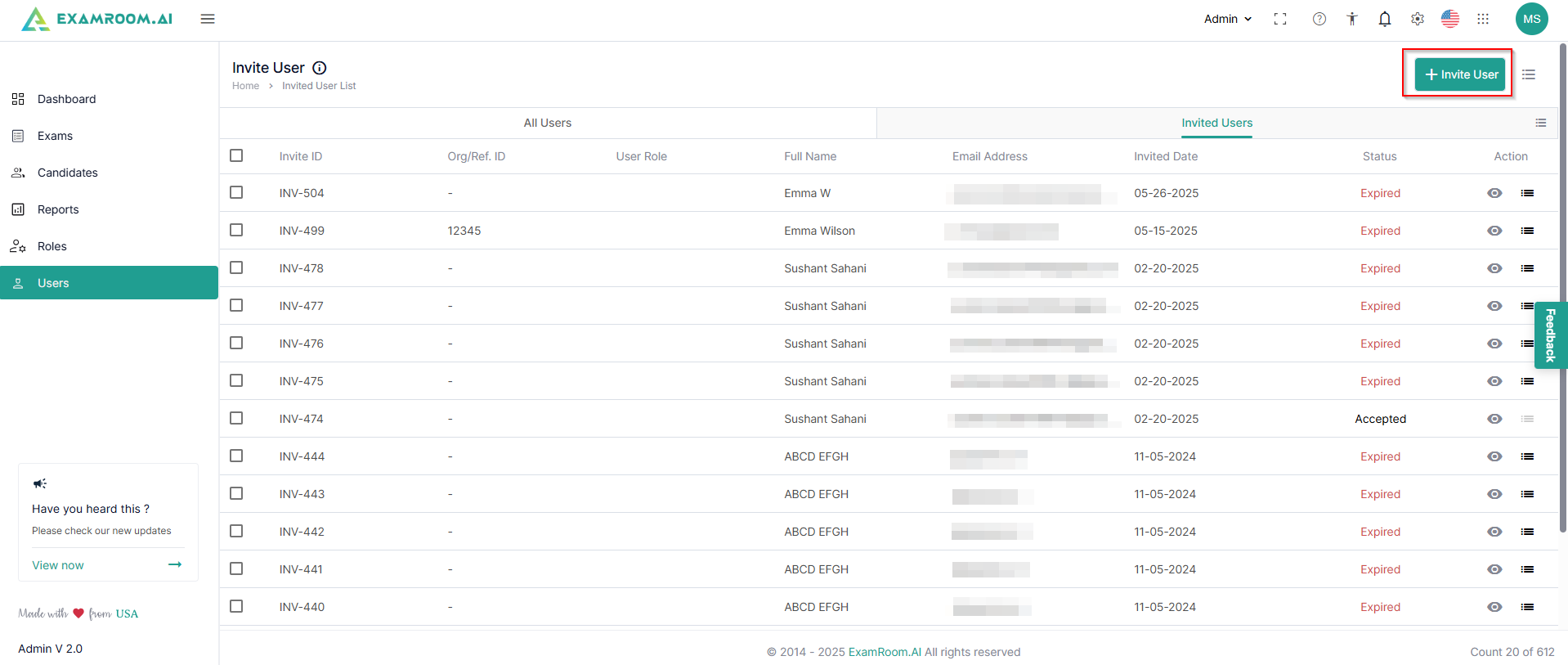 - Switch to the Invited Users list tab and click + Invite User to invite the new users.
