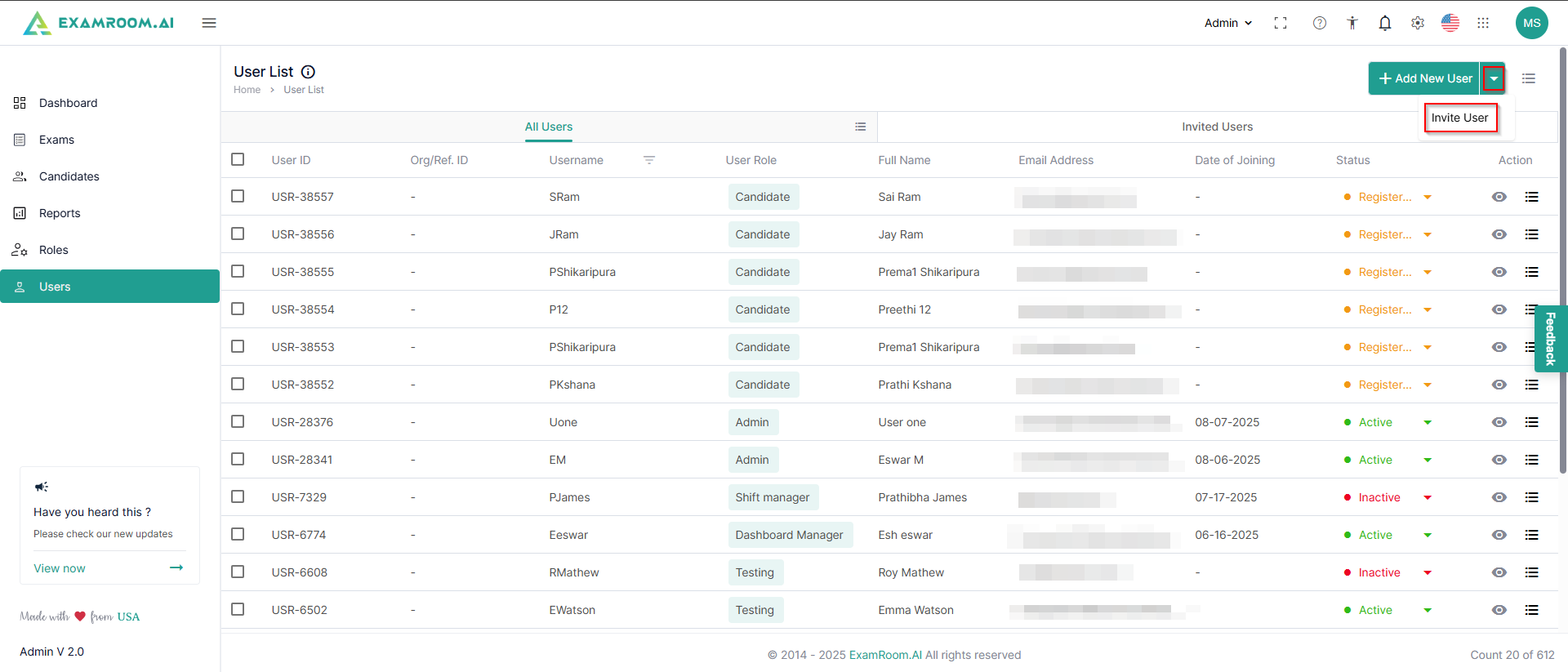 - Otherwise, if you are on the All Users tab, click the dropdown just next to the Add New User button and click Invite.