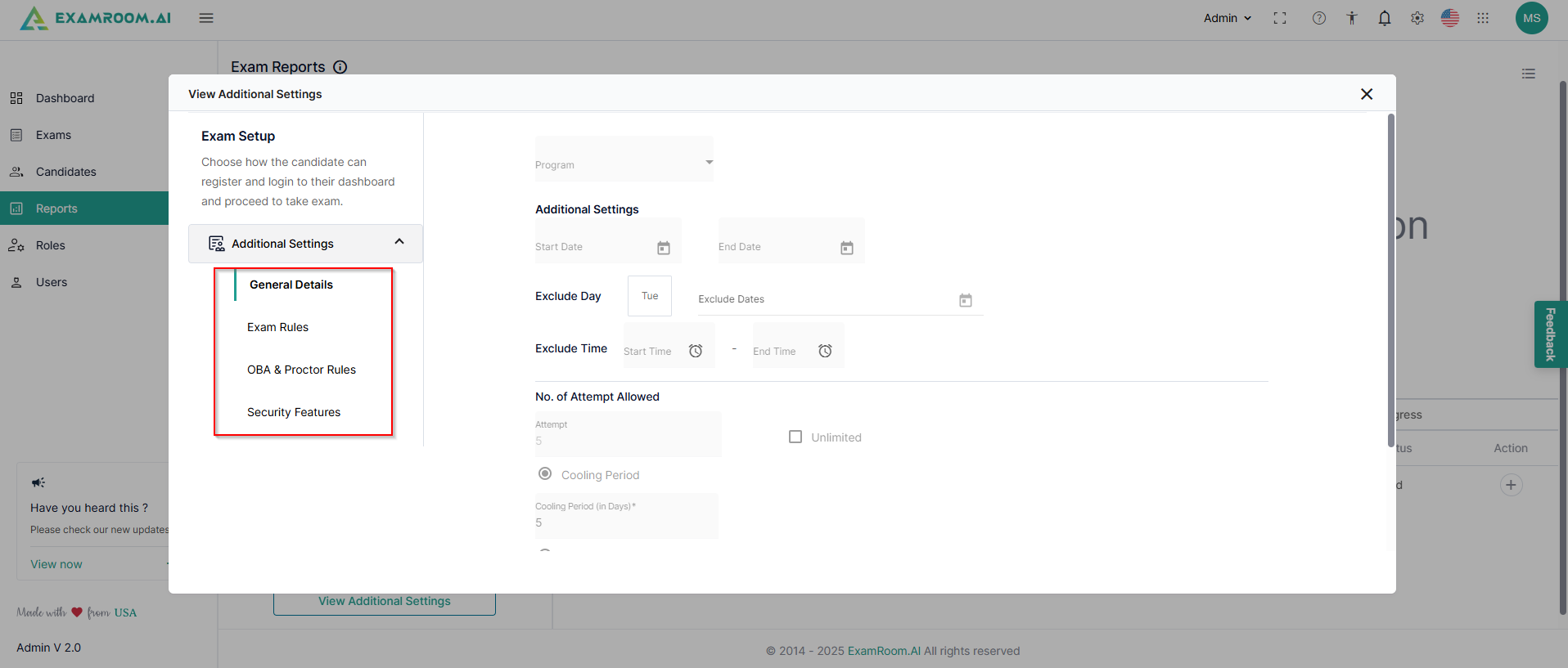 The left side of the screen has exam details available. Click ViewAdditionalSettings to check the added settings related to general details, exam rules, OBA, proctor rules, and security features.