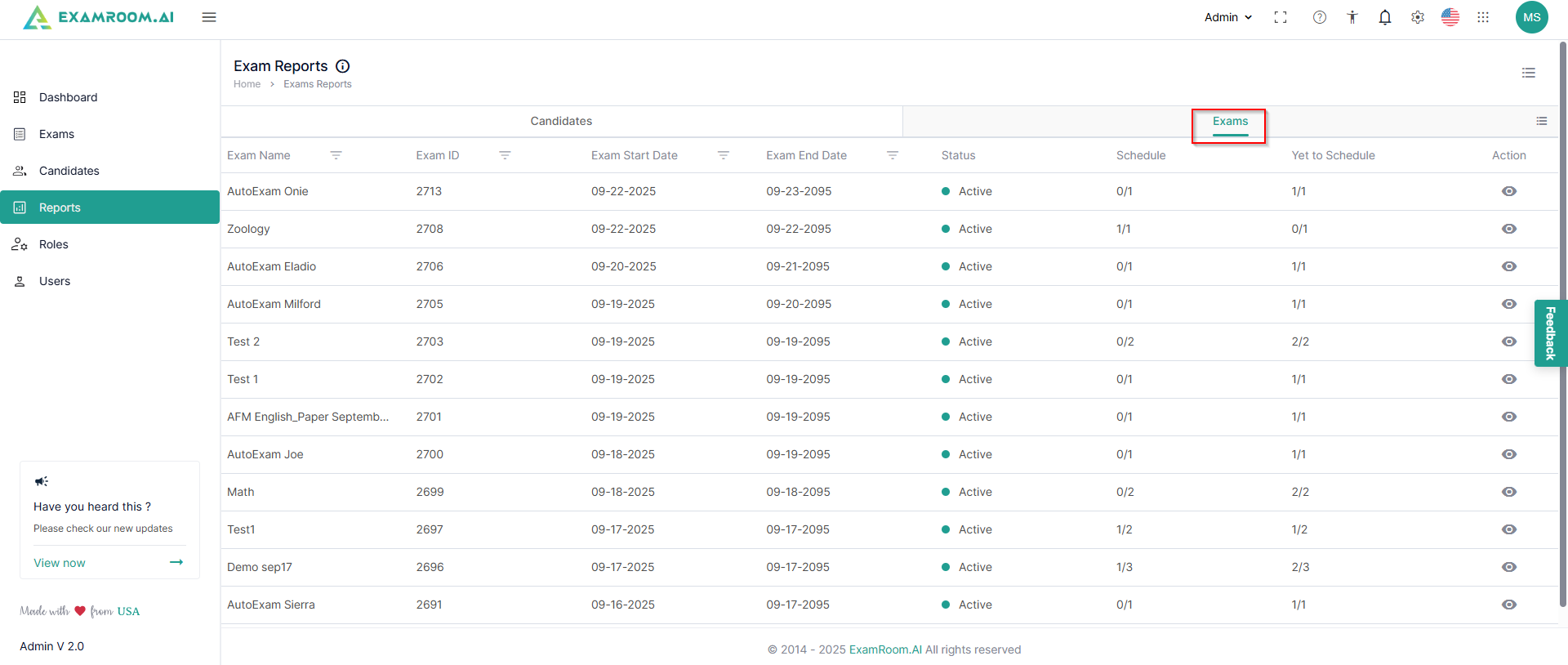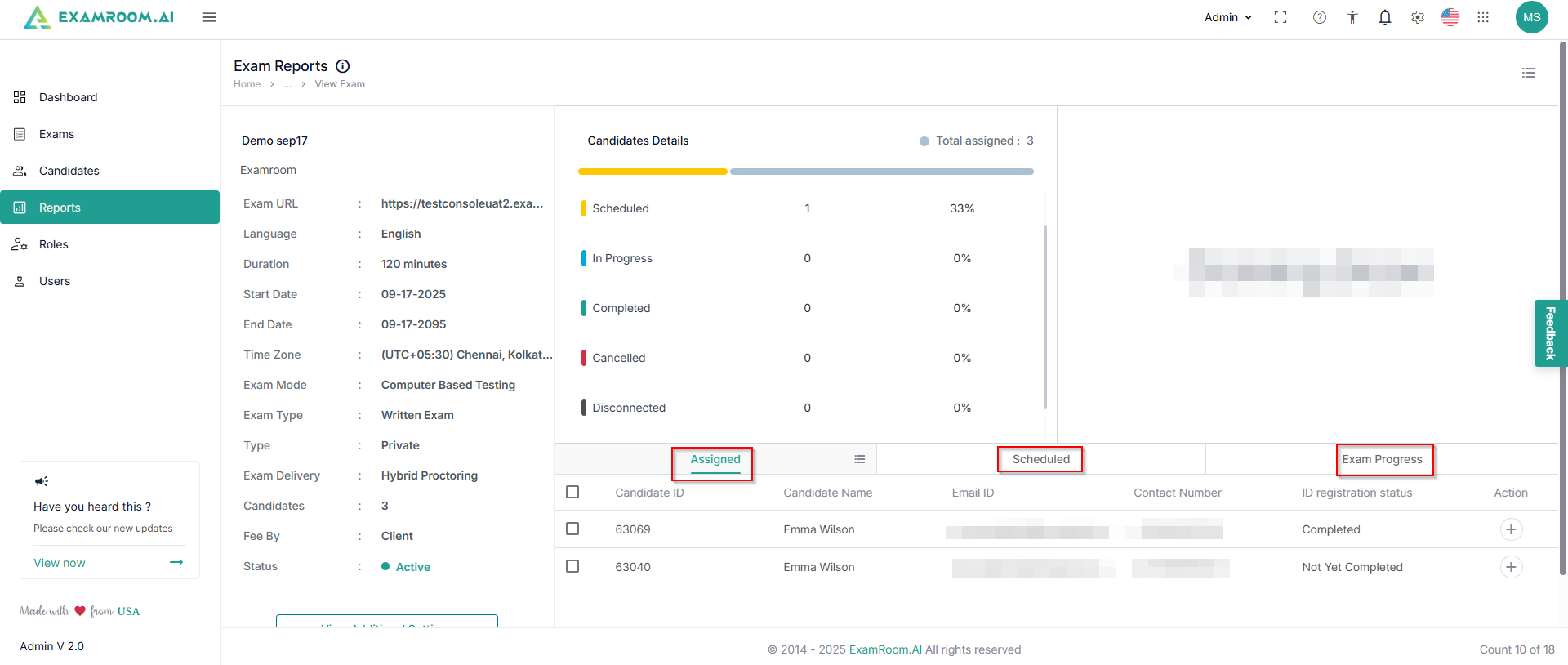 You can also check the details of the candidates segregated into the assigned, scheduled, and exam progress categories according to their current exam status.