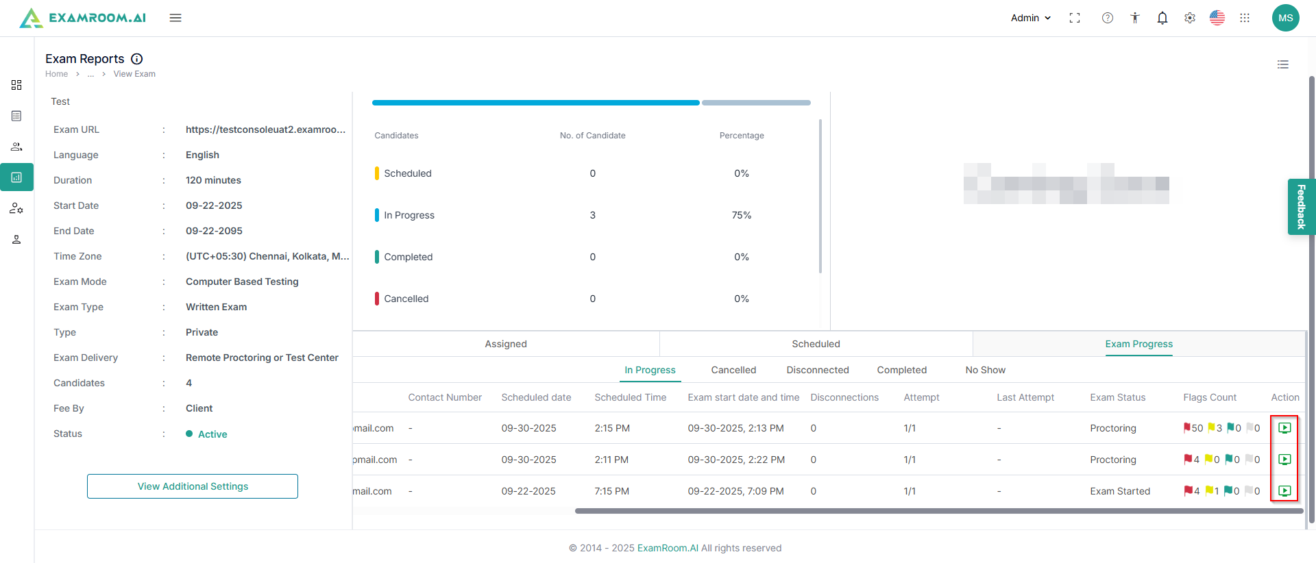 In the Exam Progress tab, there is a list of candidates who are attending a live exam. Select a particular candidate and, under action, click the Live icon to view their exam session live; this will not interrupt their testing.