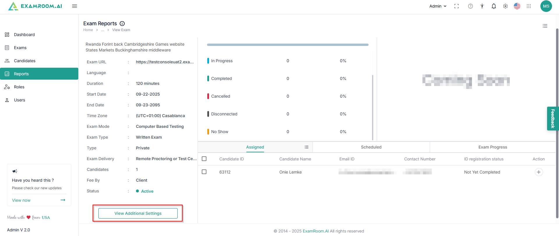 You can also check the candidate count details for the selected exam, including assigned, scheduled, in progress, completed, canceled, disconnected, and no shows.