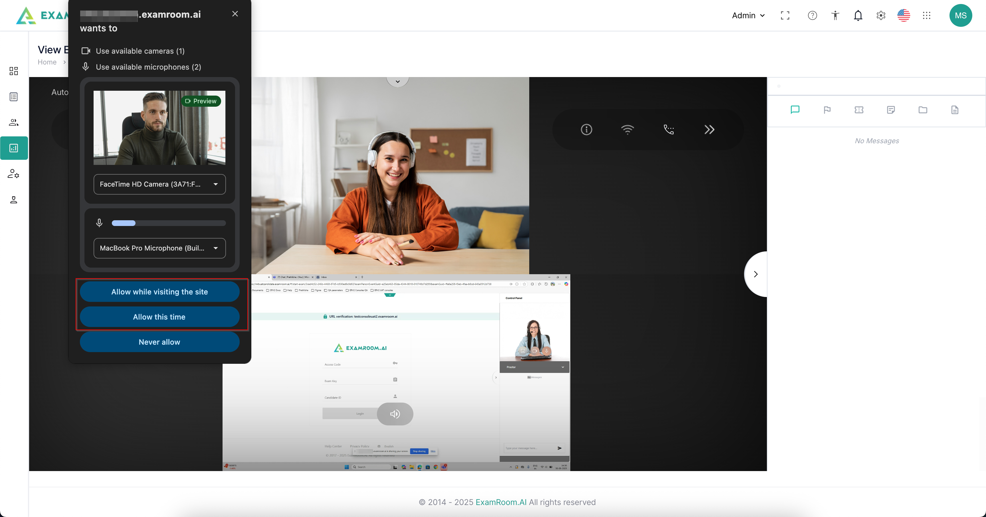 A pop-up appears to provide access to your mic and camera. Click Allow. You can also change your camera and microphone devices.