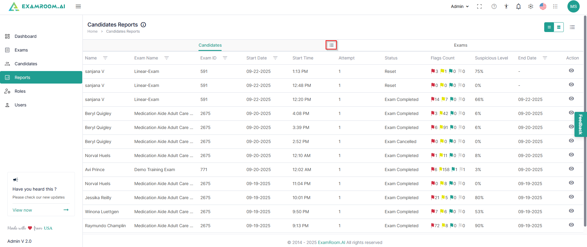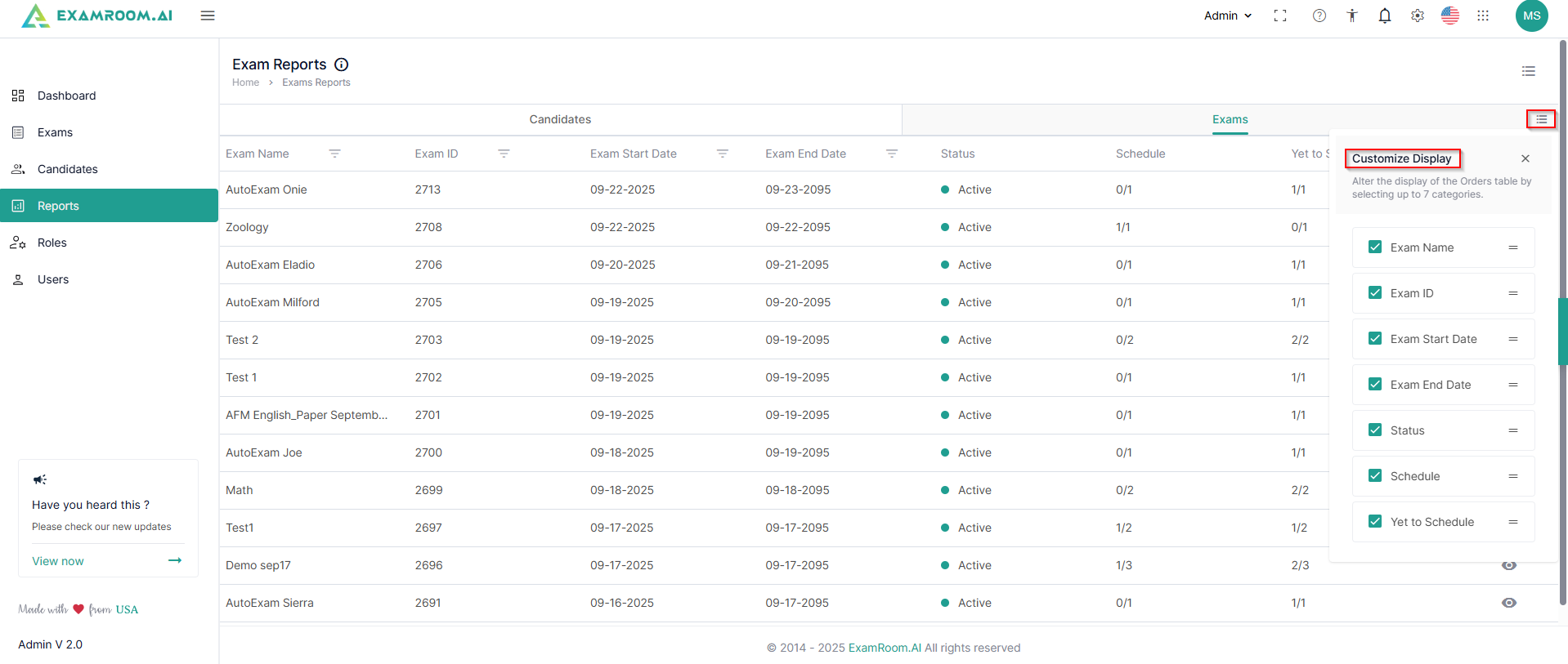The reports are further classified into Candidate and Exams. This screen can be customized to focus on any one of these sections by deselecting Candidates or Exams from the custom display.