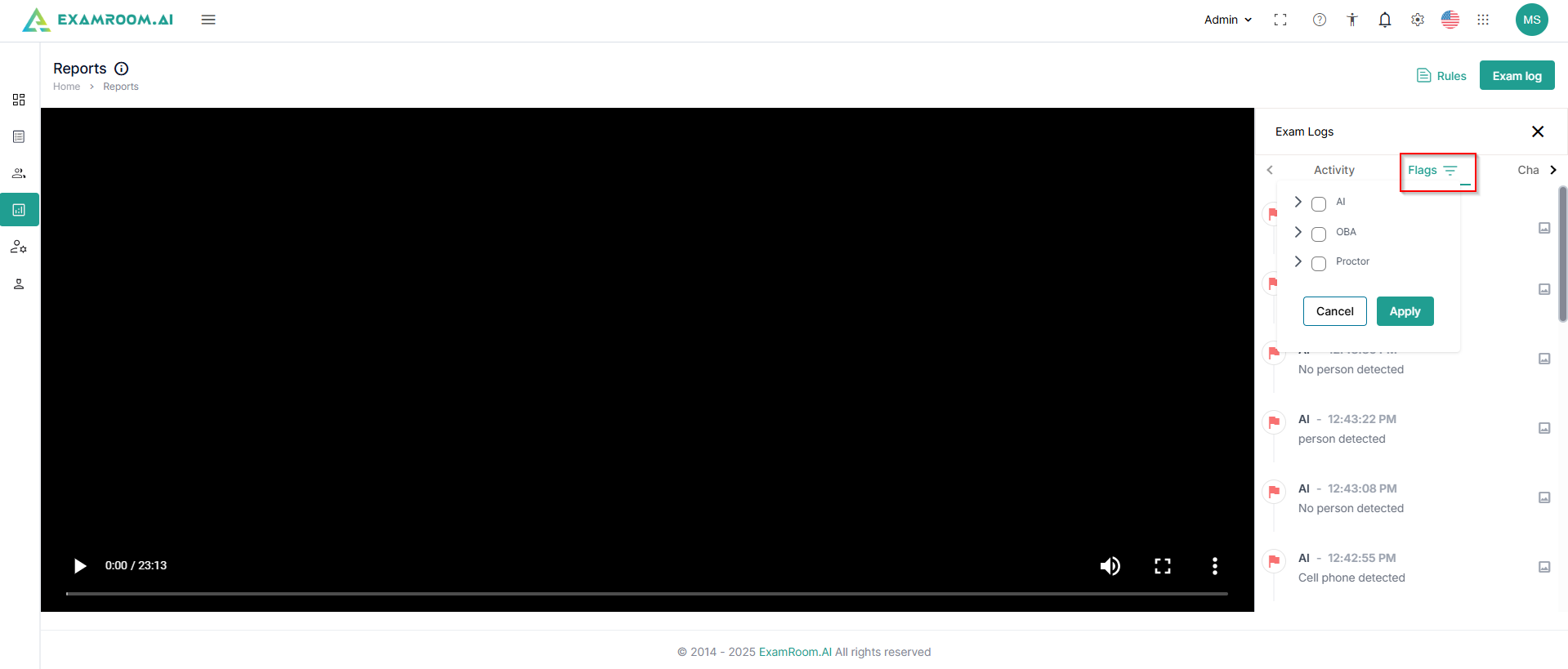 Click Flags to check the raised flags during the examination. Select the type of flag raised from the options of flags raised by AI, flags raised by OBA, and flags raised by the Proctor. Further select the color of flags raised to refine your search. You can also filter the flags by role and flag type to get accurate and desired results.