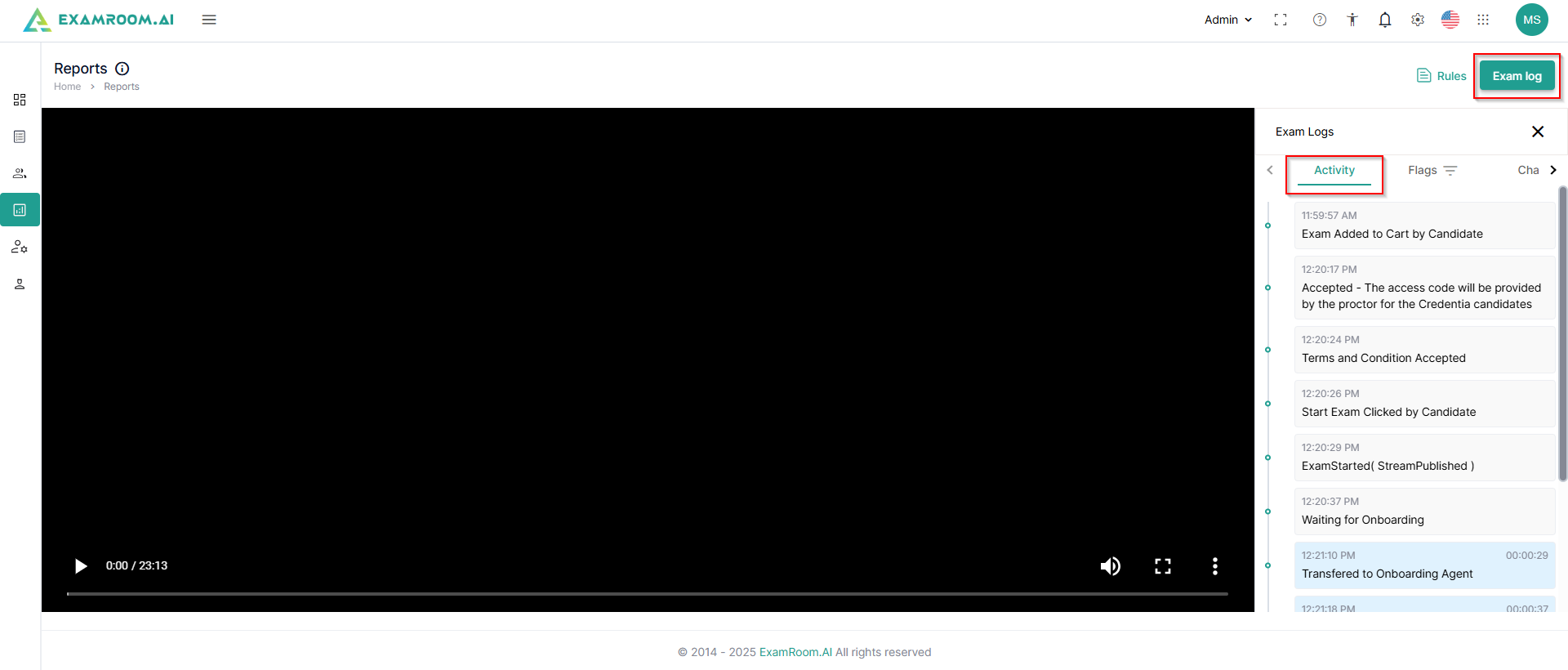 Click ExamLog to view the candidate's activity timeline during the exam.